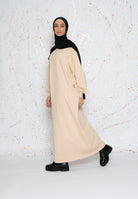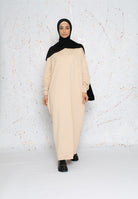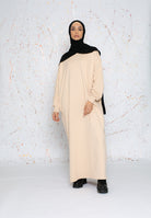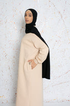 For this outfit the model wears a premium sandy jersey hijab, a beige tube hat and a pair of sneakers.