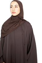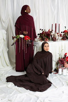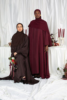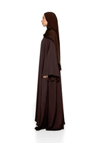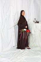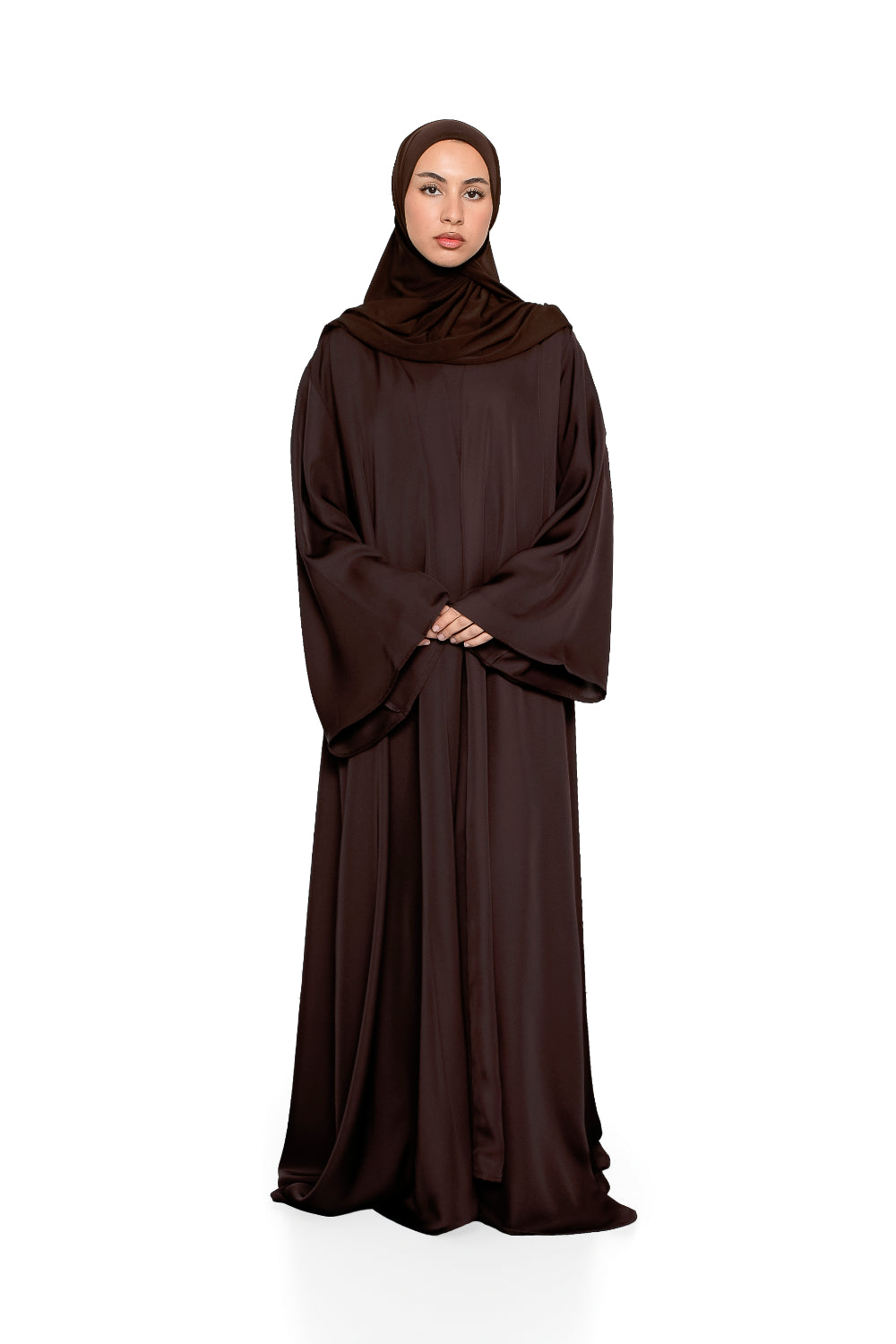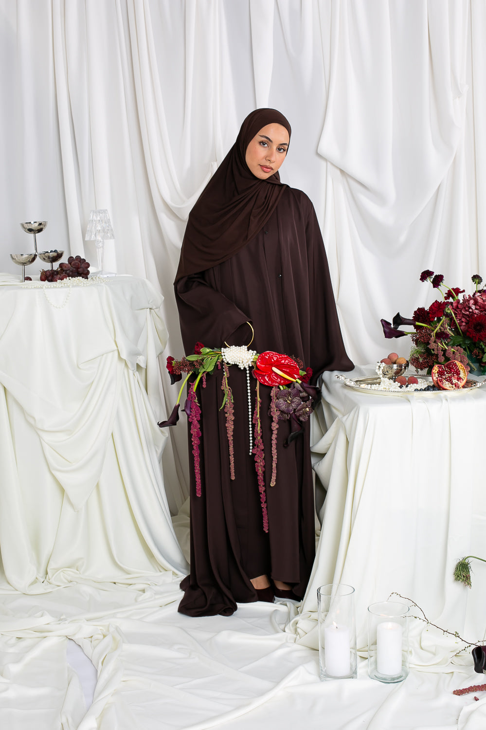 Sa coupe évasée, associée à des manches évasées, offre un tombé fluide et harmonieux qui sublime la silhouette tout en assurant une grande liberté de mouvement. L’abaya est dotée de deux pressions sur le devant, permettant de la porter fermée ou ouverte, selon les envies et les occasions. Ce détail pratique permet d’adapter facilement la pièce à différents styles et usages.