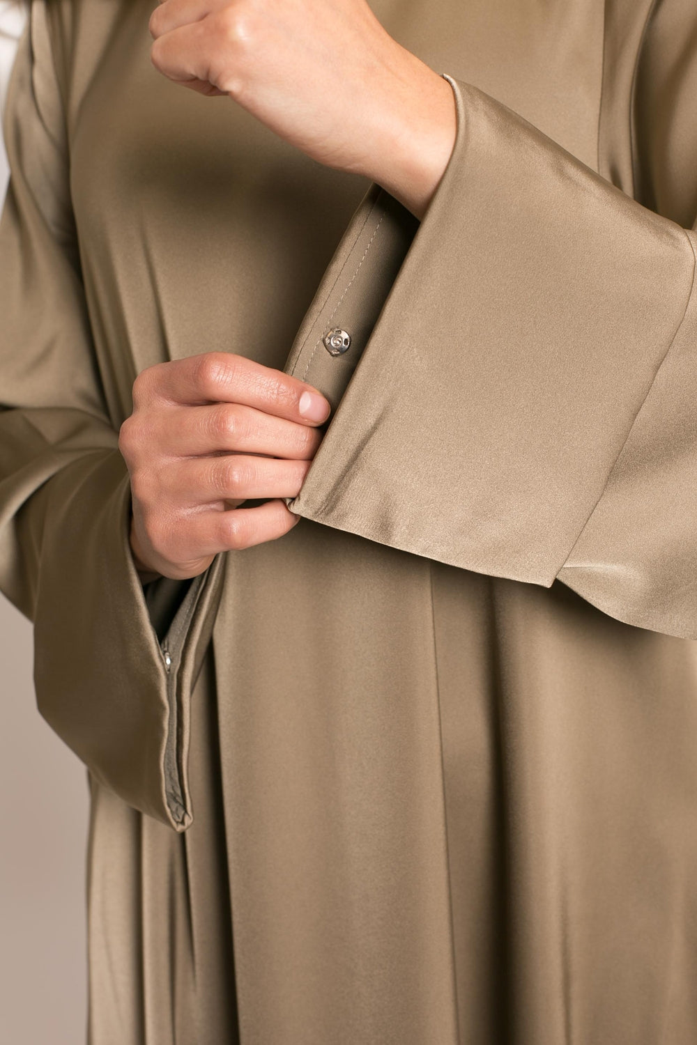 Coup de coeur pour cette sublime abaya conçut dans un tissu de très bonne qualité. Tissu fluide opaque et satiné très chic, idéal pour vos occasions. Son petit plus est une pression au niveau des manchettes et des poches pour le côté pratique. Longueur 150cm de l'épaule au bas.
