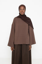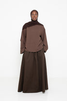 Nous l’avons porté avec le blazer en laine brown, la jupe coton dark brown et le hijab jersey premium dark brown.