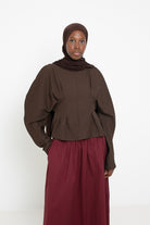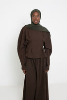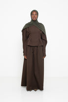 Nous l’avons porté avec la jupe coton dark brown, le hijab jersey premium dark brown et une paire de chaussures simples.