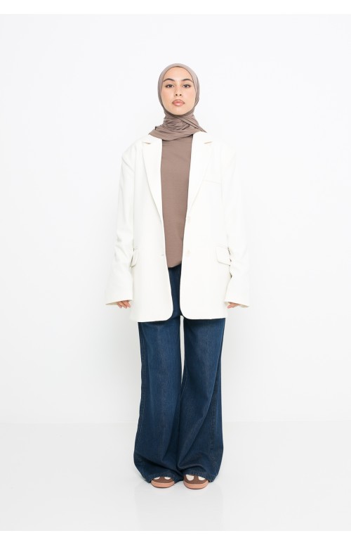 Eleganter cremefarbener Blazer, ein zeitloser Klassiker in modernem, minimalistischem Schnitt. Schicker, strukturierter Schnitt, saubere Verarbeitung und raffinierte Details. Ideal für einen klassischen Look oder einen schicken Casual-Style. Vollständig gefüttert, hochwertiger Stoff.