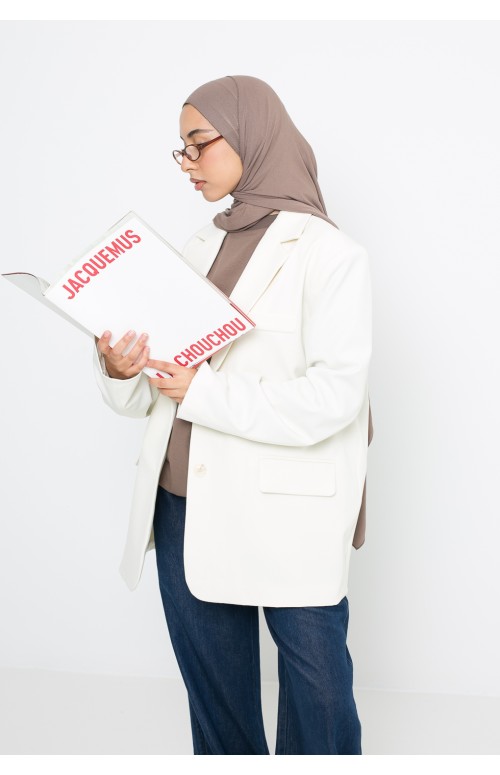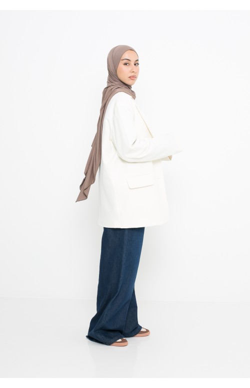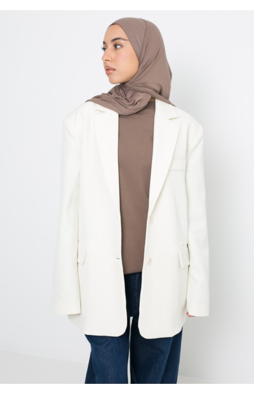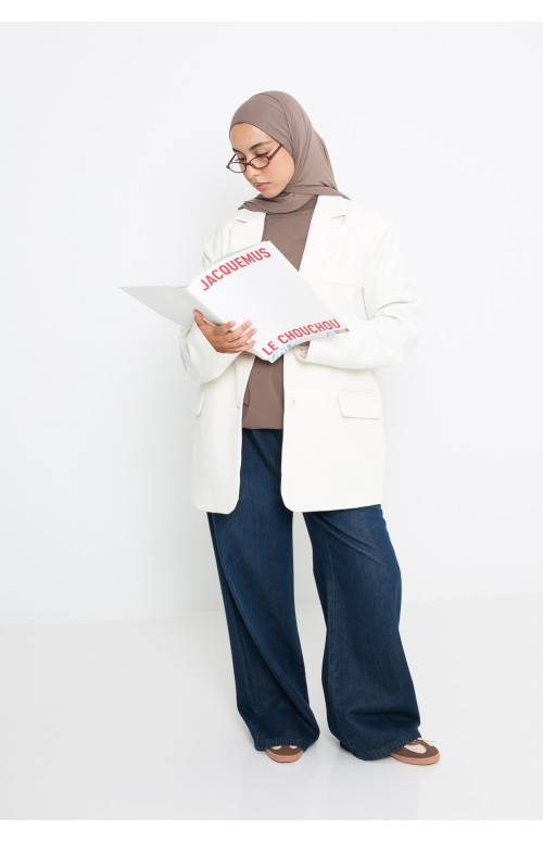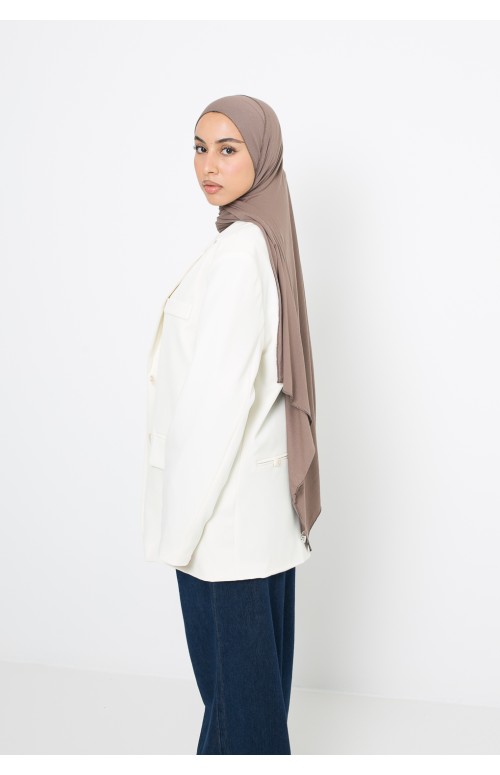 Wir haben es mit lockeren Jeans , dem in die Hose gesteckten Maxi-T-Shirt in Brauntaupe , dem luxuriösen, weichen Jersey-Hijab in Taupe und einem Paar braunen Sneakers kombiniert.