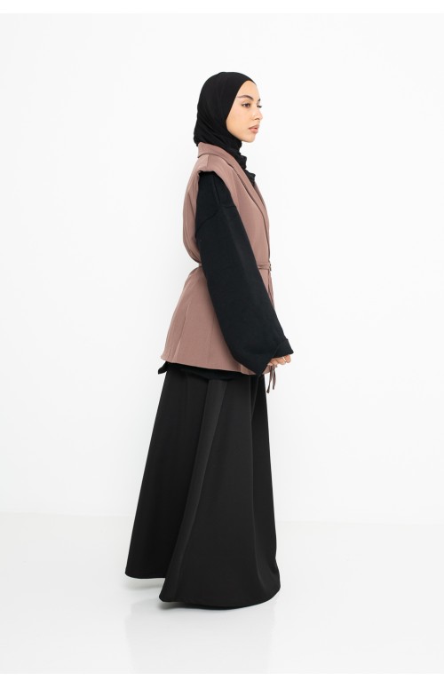 Wir trugen es mit dem Pariser Stadtrock, der schwarzen minimalistischen Weste, dem schwarzen Premium-Jersey-Hijab und einem Paar schwarzer Schuhe.
