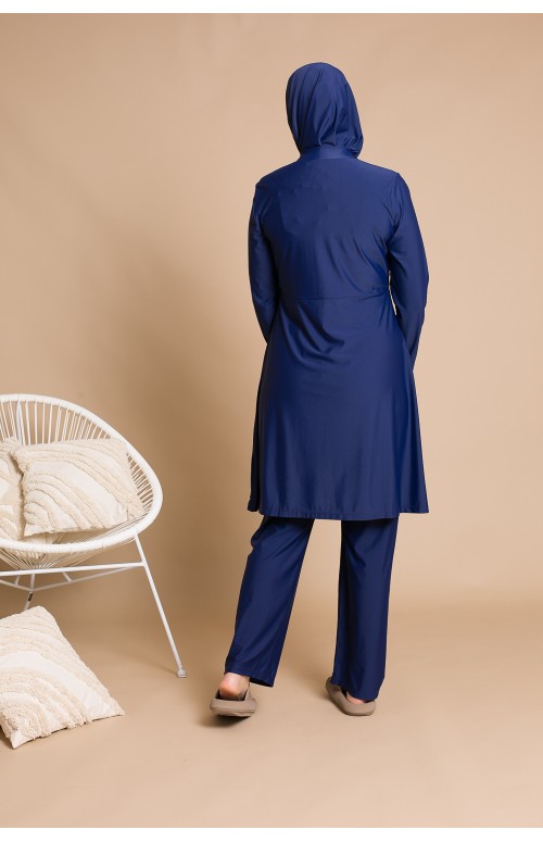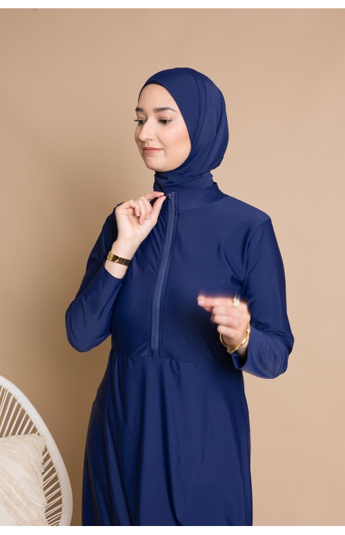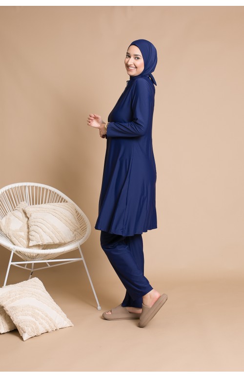 Dieses Modell ist schmaler als die anderen, wir denken an alle Stilrichtungen. Auch der Burkini mit Reißverschluss sorgte für Freude. Der Reißverschluss mit hohem Kragen ist praktisch, trendig und kann für stillende Frauen sehr nützlich sein. Dieser Burkini besteht aus einer mittellangen Tunika mit Reißverschluss und Wickelschnitt. Gerade geschnittene Badehose und ein Bade-Hijab.