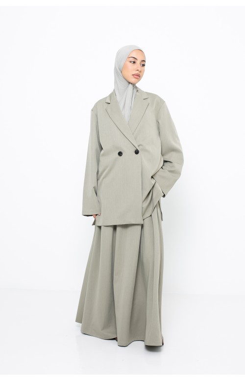 Entdecken Sie einen maßgeschneiderten Premium-Anzug aus fließendem, hochwertigem Stoff, der sorgfältig ausgewählt wurde, um Eleganz, Komfort und Haltbarkeit zu bieten. Dieses zweiteilige Set besteht aus einer eleganten Blazerjacke und einem weiten , fließenden Rock und schafft eine schicke, moderne und zeitlose Silhouette.
