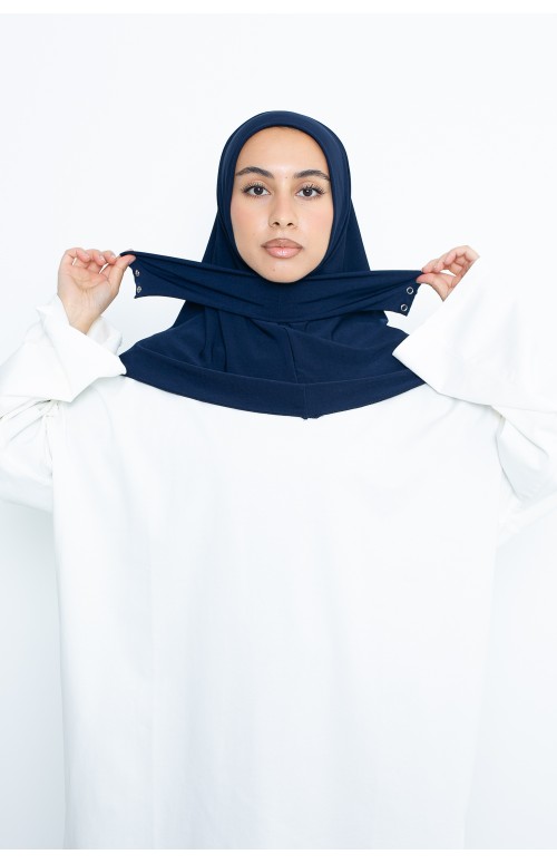 Der Hijab ist fertig zum Anziehen, einfach die Druckknöpfe auf der Rückseite schließen. Ideal für den Alltag, aber auch für den Sport und sogar für das Schwimmbad, da der Stoff sehr schnell trocknet.