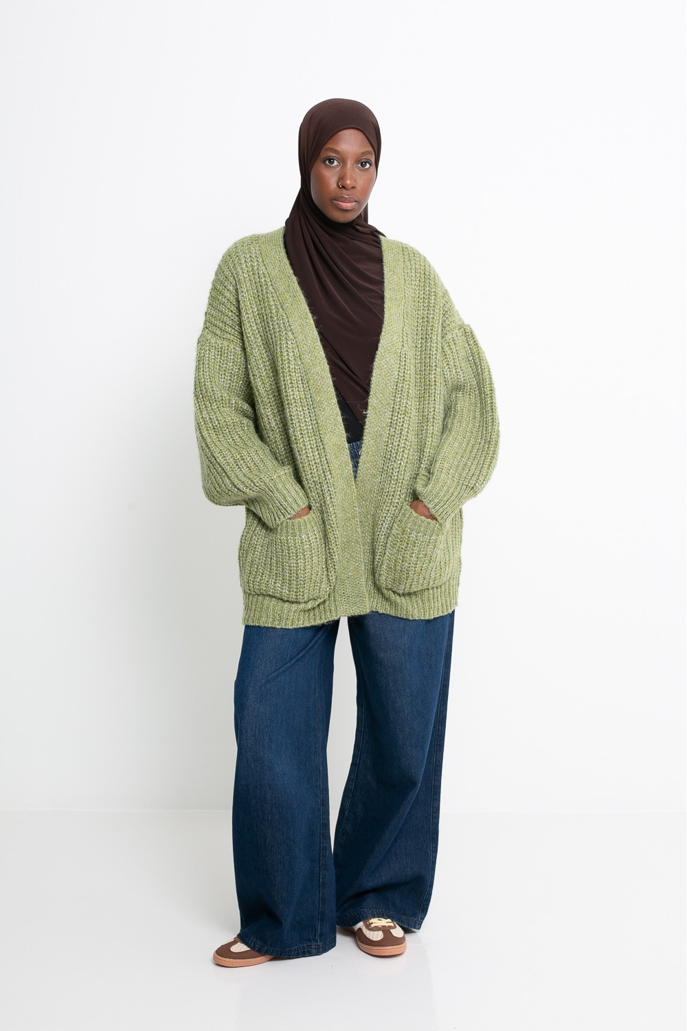Diese locker sitzende Strickjacke aus grobem Strick ist ein vielseitiges Basic, das sich leicht mit Jeans, langen Kleidern oder locker sitzenden Hosen kombinieren lässt, um in der kalten Jahreszeit moderne, warme Looks zu kreieren.