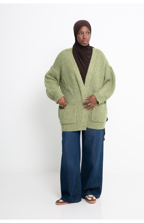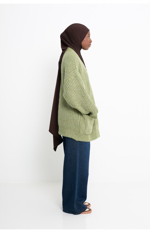 Die tiefbraune Farbe mit blauen Reflexen verleiht ihm einen einzigartigen Charme und sorgt für einen raffinierten und originellen Look. Der Oversize-Schnitt sorgt für einen fließenden und bequemen Fall, perfekt für Lagenlooks. Die Fronttaschen verleihen dem Cardigan einen praktischen und lässigen Touch und unterstreichen gleichzeitig das kuschelige Tragegefühl.