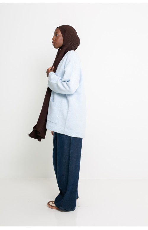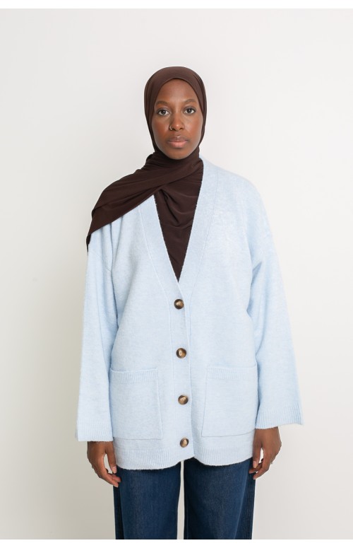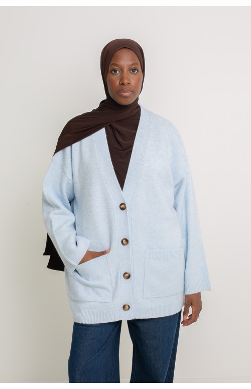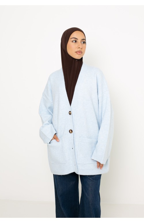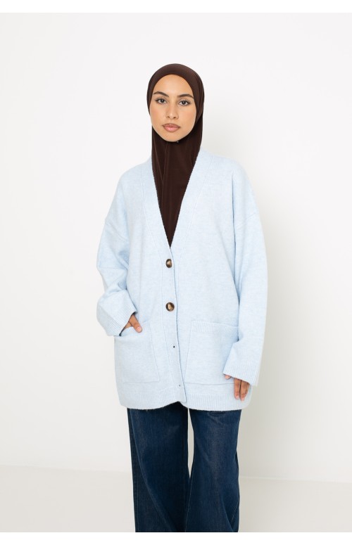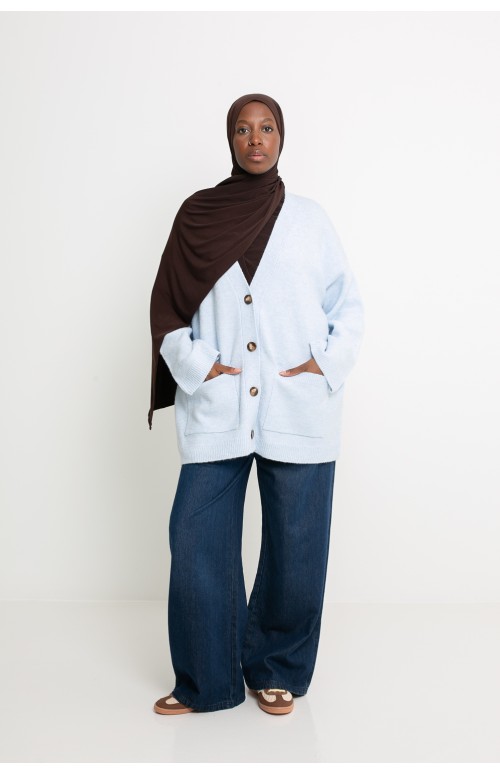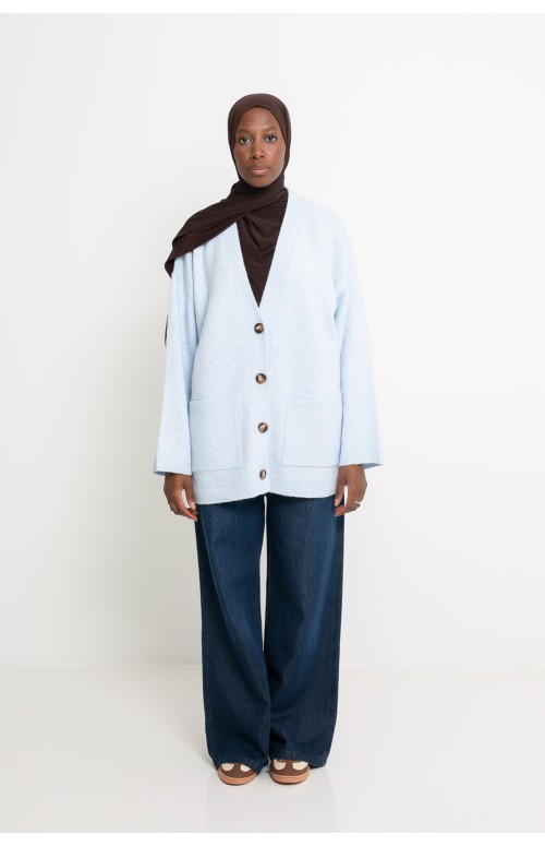 Der Oversize-Schnitt sorgt für eine glatte und bequeme Passform, perfekt für den Lagenlook. Die Fronttaschen verleihen dem Cardigan einen praktischen und lässigen Touch und verstärken gleichzeitig das gemütliche Tragegefühl.