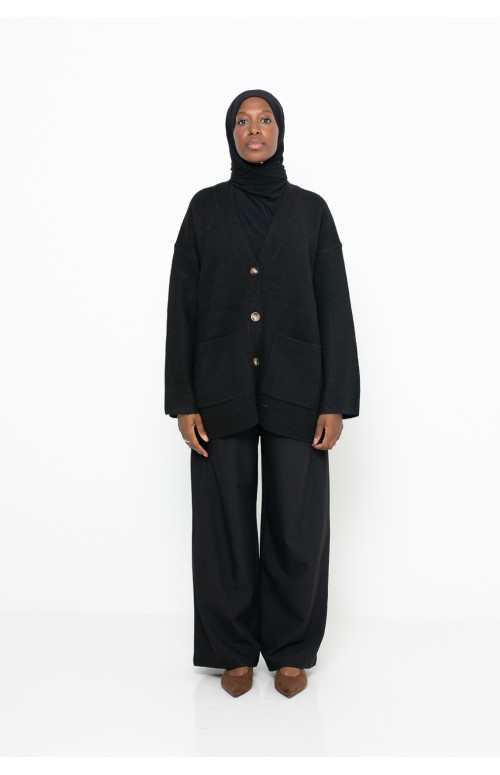 Der Oversize-Schnitt sorgt für eine glatte und bequeme Passform, perfekt für den Lagenlook. Die Fronttaschen verleihen dem Cardigan einen praktischen und lässigen Touch und verstärken gleichzeitig das gemütliche Tragegefühl.