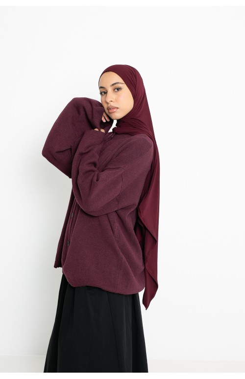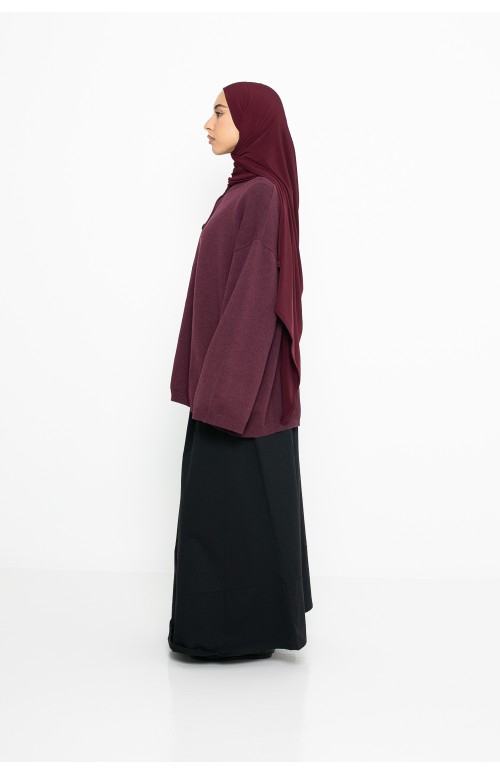 Wir haben es mit dem schwarzen Hanoi-Rock , dem burgunderfarbenen Premium-Jersey-Hijab und einem Paar schwarzer Schuhe kombiniert.