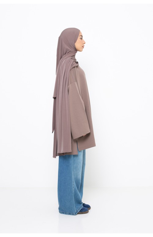 Zu diesem Outfit trugen wir die lockere Baumwollhose in Schokoladenbraun und den luxuriösen, weichen Jersey-Hijab in Taupebraun.