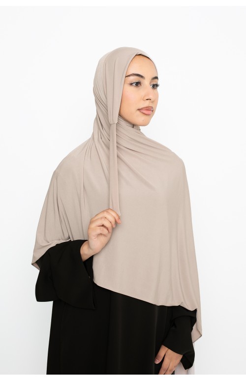 Bindefertiger Hijab aus hochwertigem Sandy-Jersey, mit asymmetrischem Design (rechte Seite länger), ohne Kappe oder Nadel, knitterfrei, blickdicht, weich und pflegeleicht.