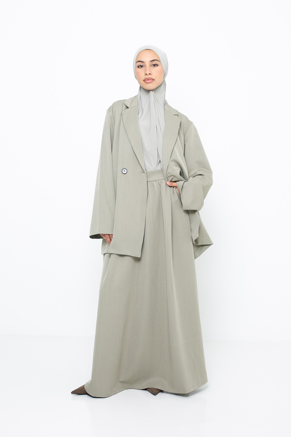 Entdecken Sie einen hochwertigen, fließenden und eleganten Rock aus dem gleichen hochwertigen Stoff wie das Blazer-Set. Sein Trapezschnitt und der raffinierte Fall machen ihn zu einem modernen, schicken und zeitlosen Kleidungsstück, das Ihre Outfits zu allen Gelegenheiten begleitet.
