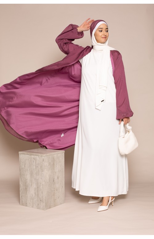 Für diesen Stil haben wir uns entschieden, ihn mit dem Set aus Kimono und Pareo mit Puffärmeln zu tragen. Um das Outfit abzurunden, ein Hijab aus Medina -Seide.