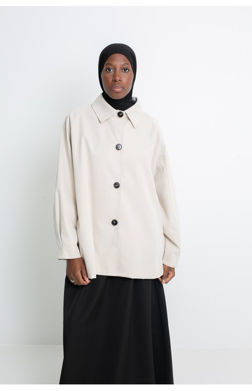 Die zweifarbigen braunen Knöpfe , inspiriert vom traditionellen Trenchcoat, fallen dezent auf und verleihen dem Kleidungsstück eine raffinierte Note. Die Ballonärmel mit präzisen Falten verleihen Volumen und einen raffinierten femininen Look. Darüber hinaus verfügt die Jacke über praktische Seitentaschen , die diskret integriert sind, um die reinen und eleganten Linien zu bewahren.