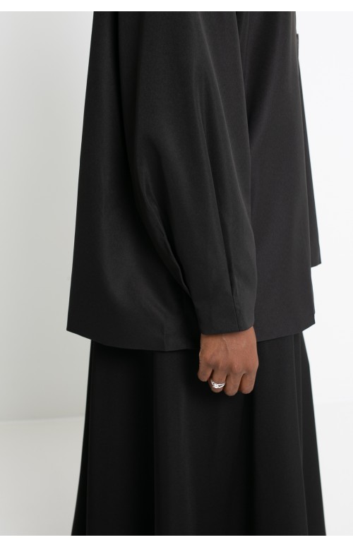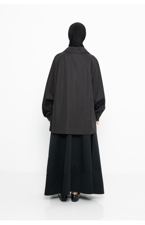 Wir trugen es mit lockeren Raw Jeans, einem schwarzen Premium-Jersey-Hijab und einem Paar burgunderfarbenen Schuhen .