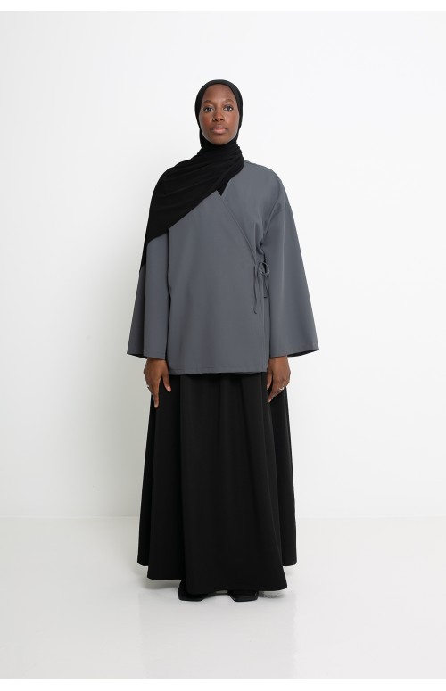Wir haben uns für ein elegantes Outfit entschieden. Dazu haben wir eine graue Hose, einen burgunderfarbenen Hijab aus Premium-Jersey und burgunderfarbene Schuhe kombiniert.