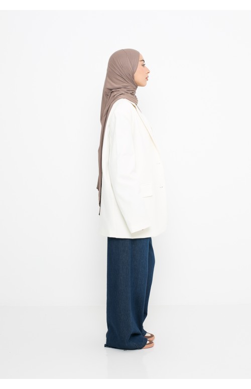 We paired it with raw loose jeans , the tucked-in maxi t-shirt in brown taupe , the lux soft taupe jersey hijab and a pair of brown sneakers.