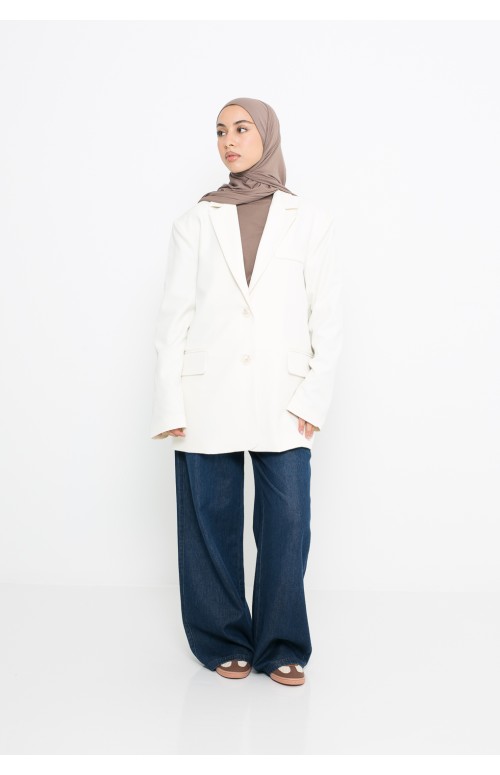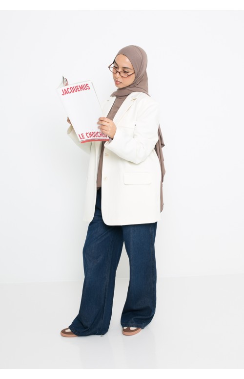This elegant women's blazer embodies refined simplicity and dressy style. Designed in a straight and clean cut, it is distinguished by its classic tailored collar , its practical flap pockets at the front , and an original detail at the back: a fake buttoned pocket , which adds a chic and subtle touch to the ensemble.
