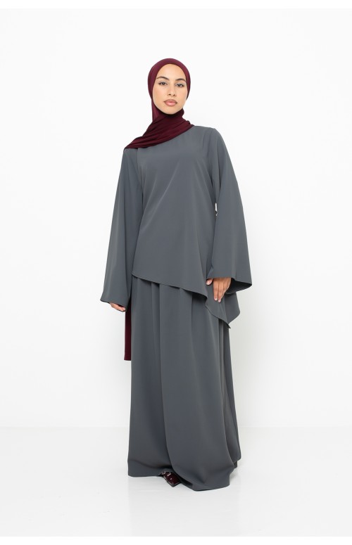 Discover a refined and timeless ensemble, crafted from a flowing, high-quality fabric, designed to last. This ensemble consists of an asymmetrical top and a full-length skirt with an elasticated waistband, subtly combining comfort and elegance.