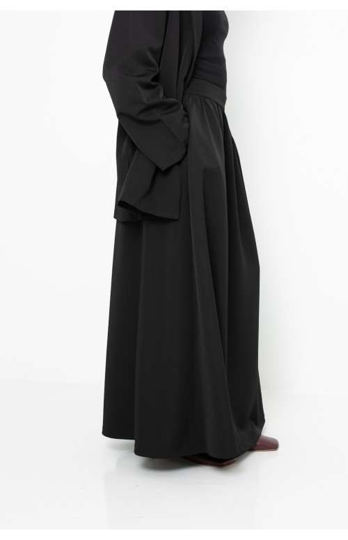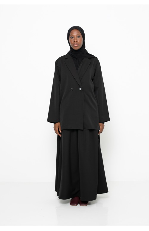 Discover a premium tailored suit , designed in a flowing, high-quality fabric, carefully selected to offer elegance, comfort and durability. This two-piece set consists of a sophisticated blazer jacket and a wide, flowing A-line skirt, creating a chic, modern and timeless silhouette.