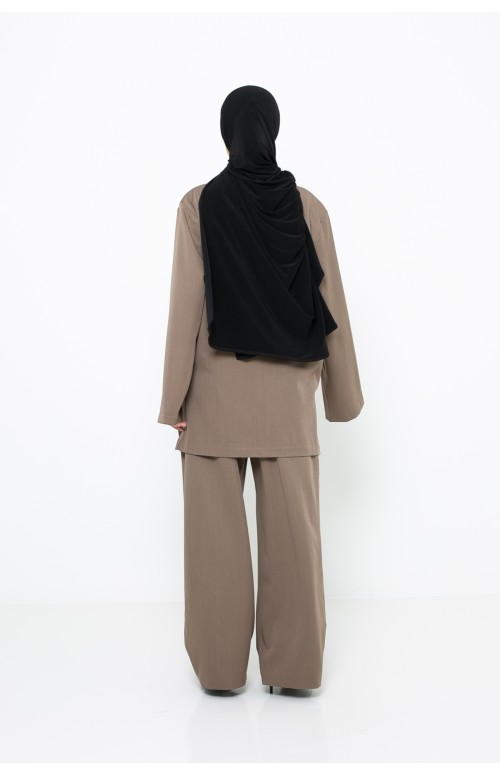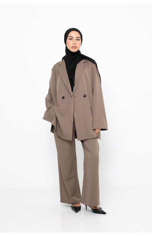Discover a premium tailored suit , designed in a flowing, high-quality fabric, carefully selected to offer elegance, comfort and durability. This two-piece set consists of a sophisticated blazer jacket and wide, flowing trousers , creating a chic, modern and timeless silhouette.
