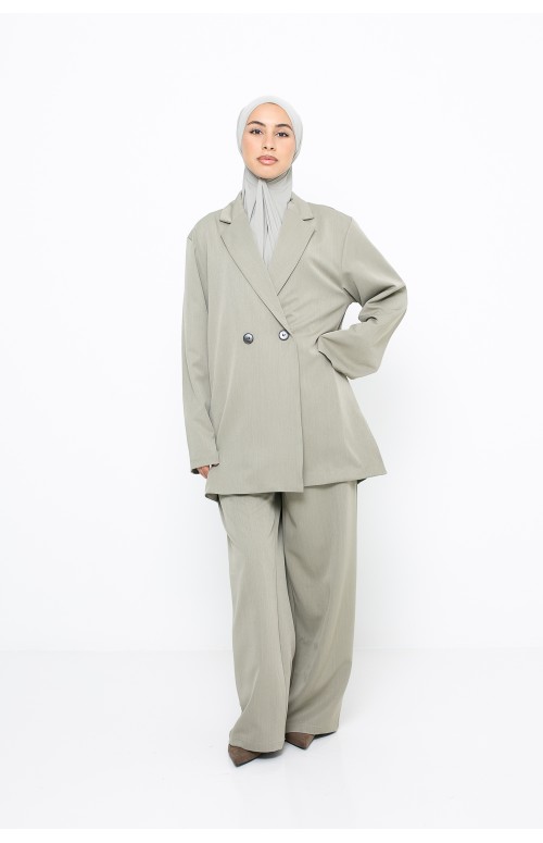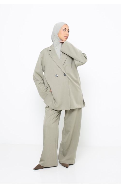 Discover a premium tailored suit , designed in a flowing, high-quality fabric, carefully selected to offer elegance, comfort and durability. This two-piece set consists of a sophisticated blazer jacket and wide, flowing trousers , creating a chic, modern and timeless silhouette.
