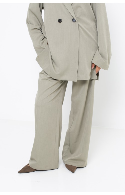 The trousers complement the jacket with understated elegance. Their elasticated waistband ensures comfort and adaptability, while their straight, wide cut emphasizes the overall look's fluid and refined appeal. The carefully selected fabric offers impeccable drape, lasting comfort, and quality that lasts through the seasons.