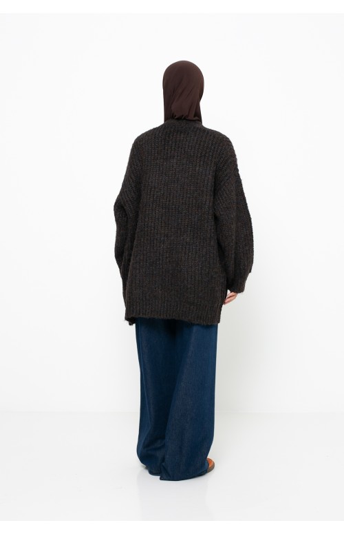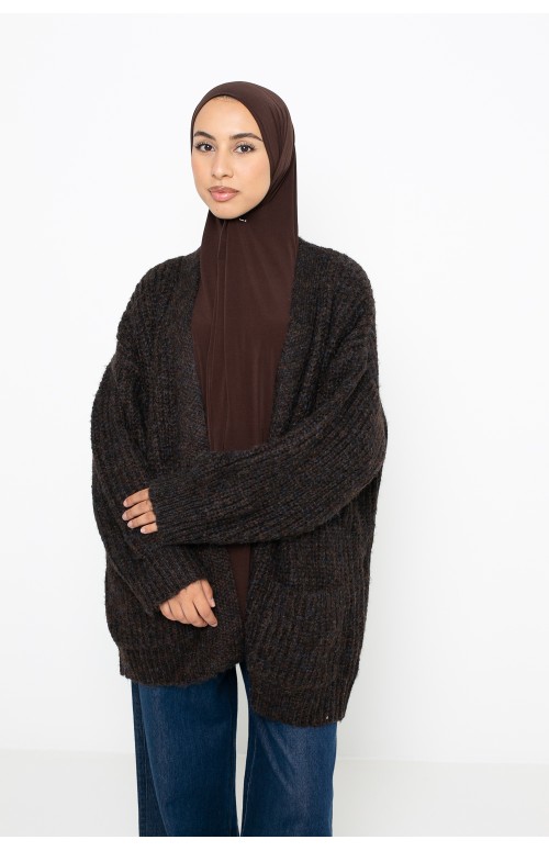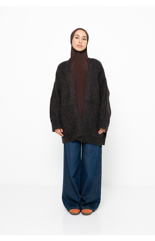 Its deep brown color with blue hues gives it a unique charm, for a sophisticated and original look. The oversized cut ensures a fluid and comfortable drape, perfect for layering. The front pockets add a practical and casual touch, while reinforcing the cozy feel of this cardigan.