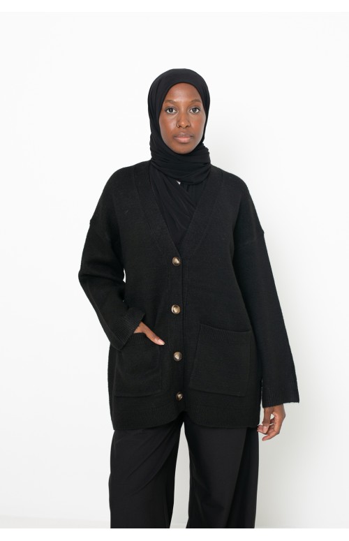 This loose-fitting, warm and comfortable knitted cardigan with practical front pockets is the ideal piece for cozy and trendy autumn-winter looks.