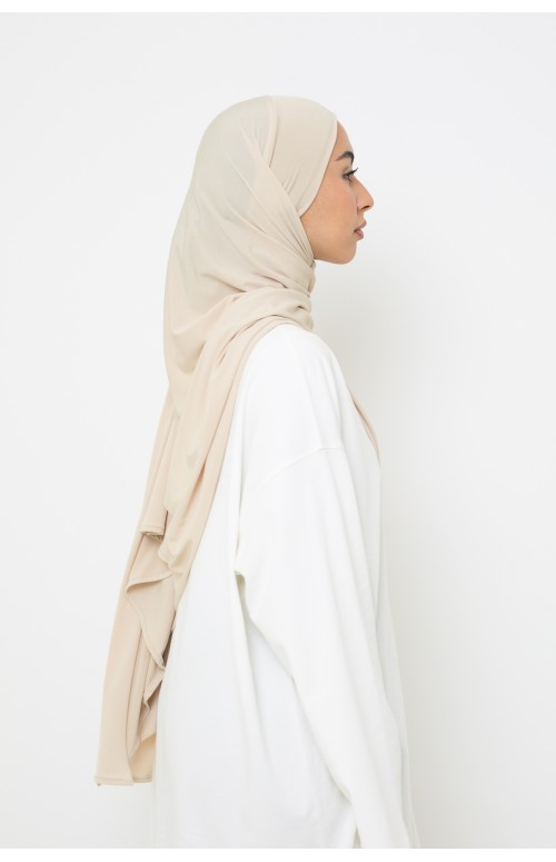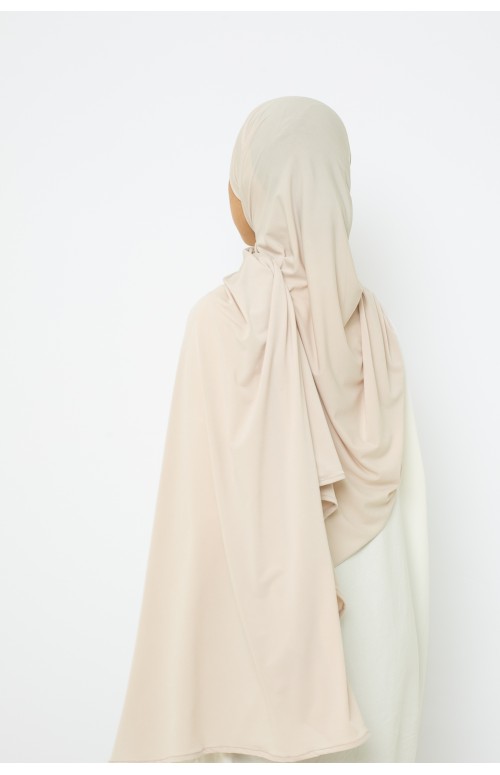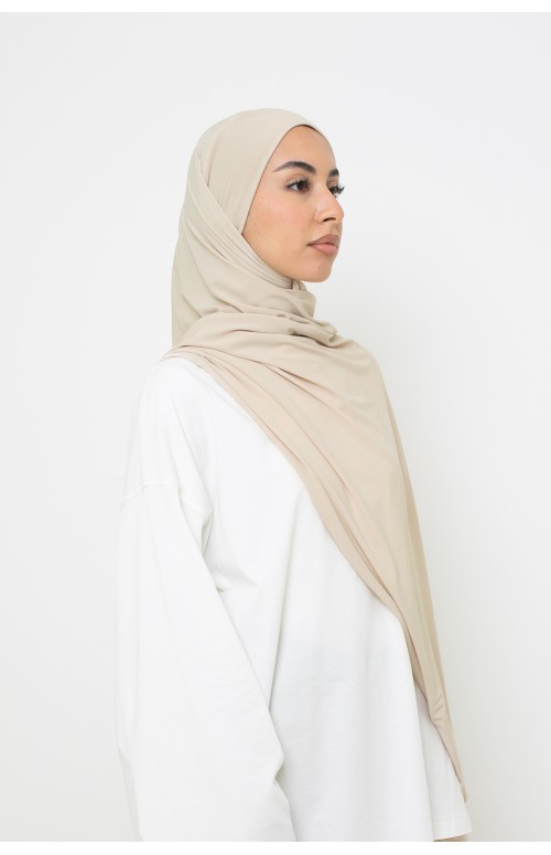 Ready-to-tie hijab in premium Sandy jersey, with an asymmetrical design (longer right side), without cap or pin, wrinkle-free, opaque, soft and easy to care for.