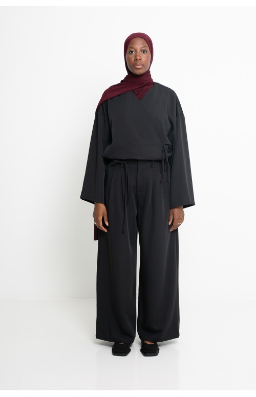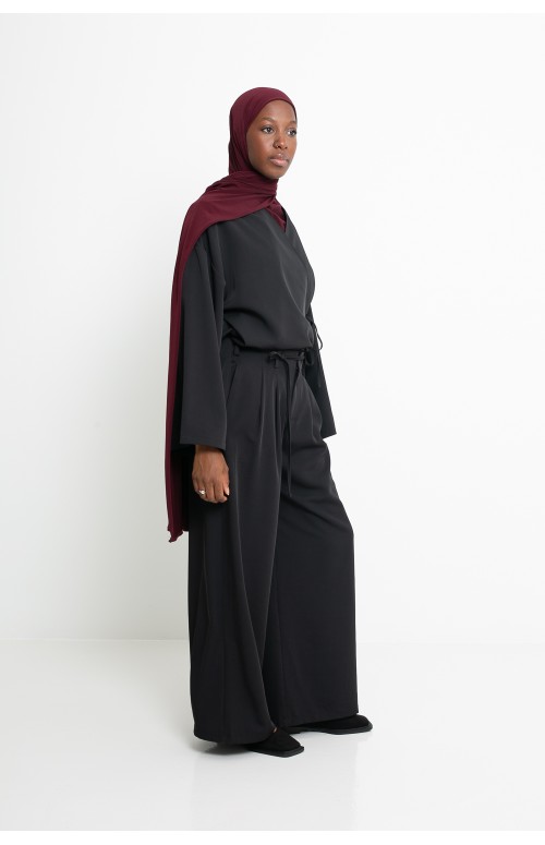 For an even more dressed-up look, wear them with a matching blazer and a structured hijab , creating a professional and elegant outfit. For a more casual version, these pants pair perfectly with an oversized shirt and chic loafers .