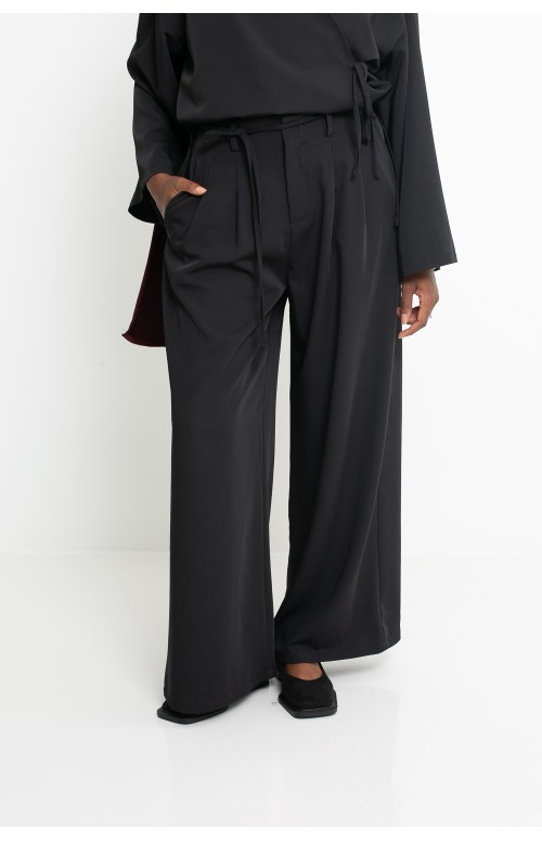 Elegant tailored trousers with a loose fit, refined pleats and a hybrid waistband (smooth front, elastic back). Comfortable and dressy, they pair well with a shirt, blazer, or tie-front jacket.