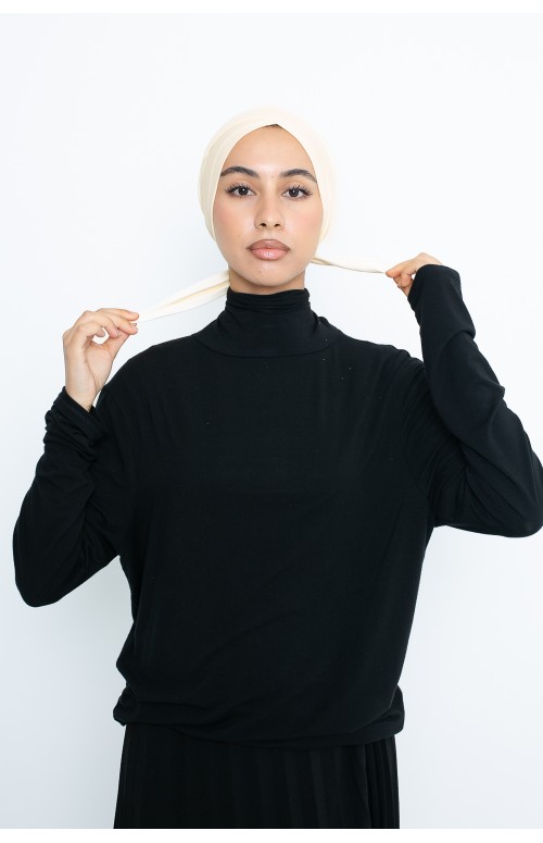 For this outfit we wore the white Salam summer loose casual pants, an off-white premium sandy jersey ready-to-tie hijab. You can also wear the oversized t-shirt with wide jeans and sneakers.