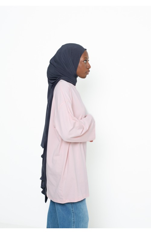 The model is 1.70m tall and wears a S/M for a usual 36. Mariam wears the loose middle blue jeans with the premium anthracite jersey hijab.