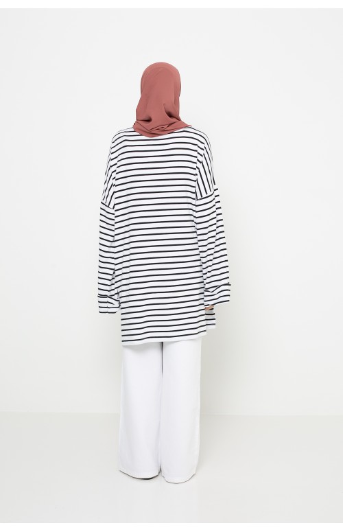 Embrace stylish comfort with our CM sailor top. Crafted from premium viscose, it's sure to impress with its fluidity, lightness, and perfect opacity. Its loose fit, unique boat neckline—ideal for a well-positioned hijab without revealing any skin—and thoughtful details like cuffed sleeves and small slits make it as practical as it is fashionable.