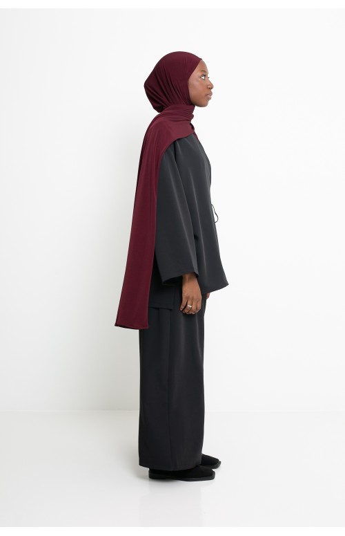 We opted for a classy, dressy outfit. To achieve this, we paired it with gray tailored pants, a burgundy premium jersey hijab, and a pair of burgundy shoes.