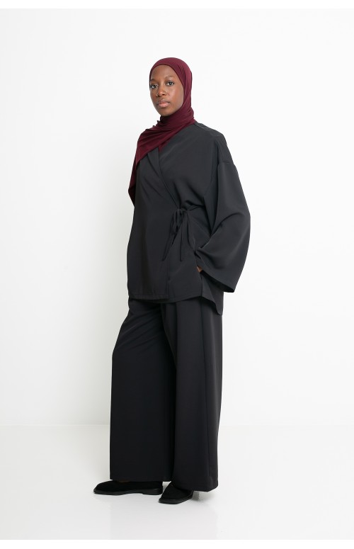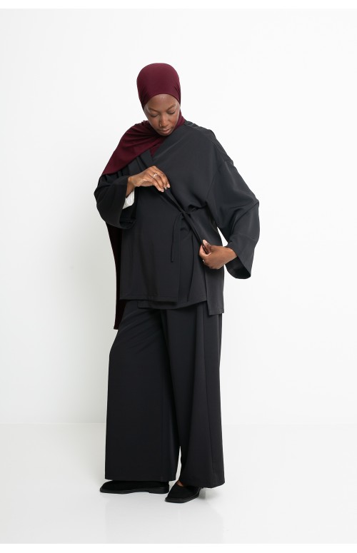 This tie-up jacket is a flowing, elegant and modern piece, designed to combine comfort and refinement. Made from the same premium fabric as the tailored trousers , it seduces with its high-quality, flowing, opaque and durable material , designed to last over time while offering a pleasant feeling when worn.