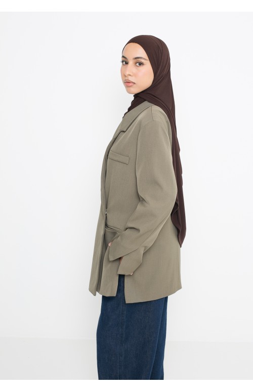 Lo combinamos con unos vaqueros holgados de color crudo , un hijab de jersey premium marrón oscuro y un par de zapatos negros.