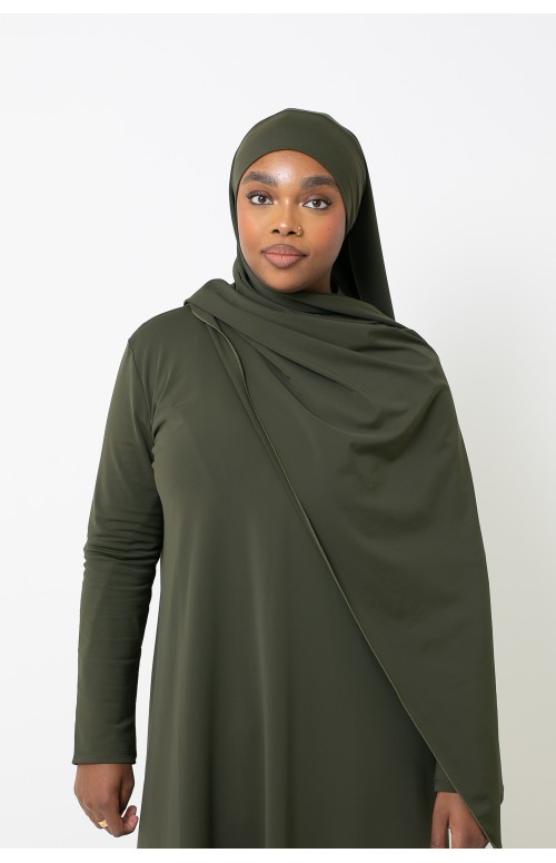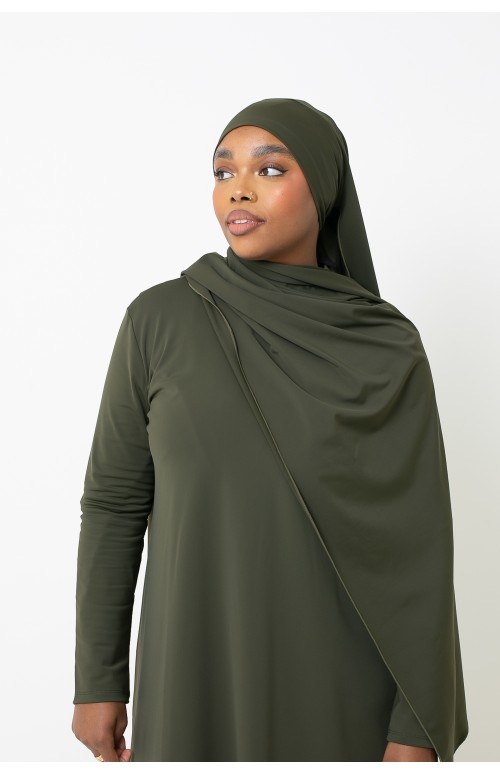 - Un hijab listo para atar: es el mismo modelo que vendemos habitualmente pero en tejido burkini, por lo que la sujeción es óptima.