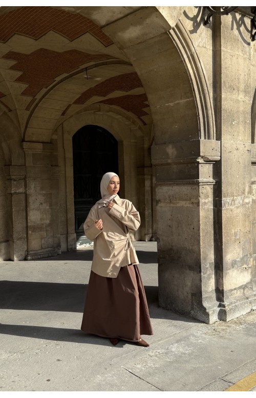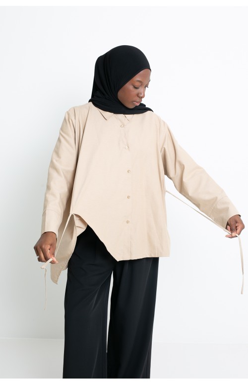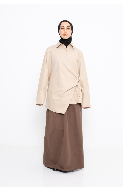Una elegante camisa asimétrica con lazo frontal, pliegues refinados y botones a tono. Confeccionada en tela duradera de primera calidad, combina a la perfección con una falda y un hiyab para un look refinado. Diseñada por CM.