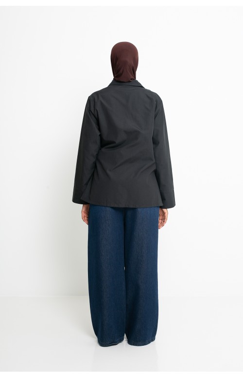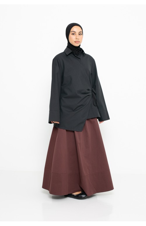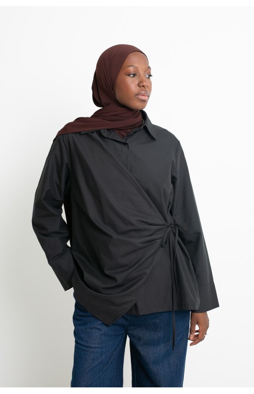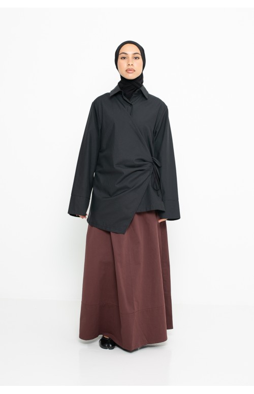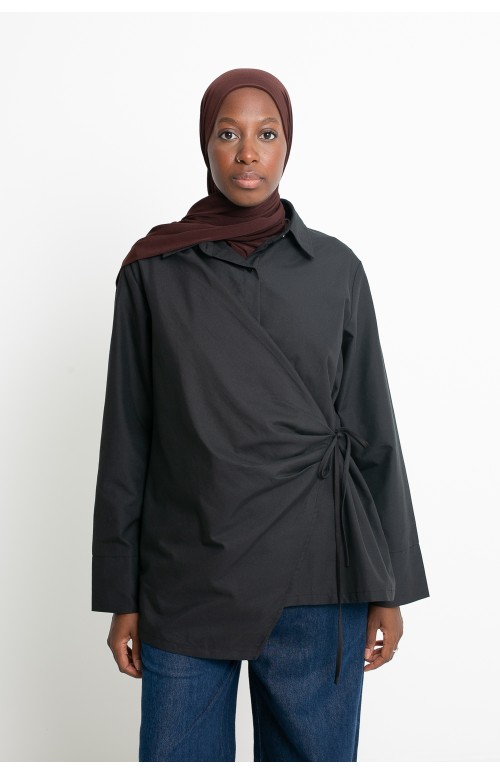 Una elegante camisa asimétrica con lazo frontal, pliegues refinados y botones a tono. Confeccionada en tela duradera de primera calidad, combina a la perfección con una falda y un hiyab para un look refinado.