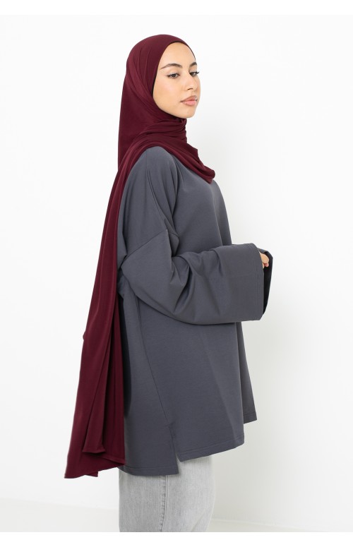 Para este atuendo usamos jeans holgados de color gris y un hijab de jersey premium color burdeos .