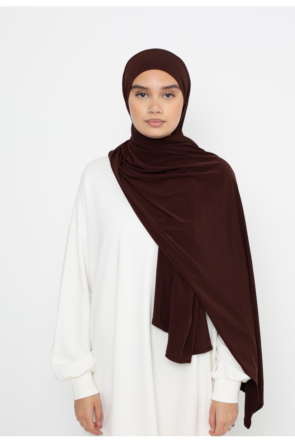 Hiyab listo para atar en jersey premium Sandy, con diseño asimétrico (lado derecho más largo), sin gorra ni alfiler, antiarrugas, opaco, suave y de fácil cuidado.