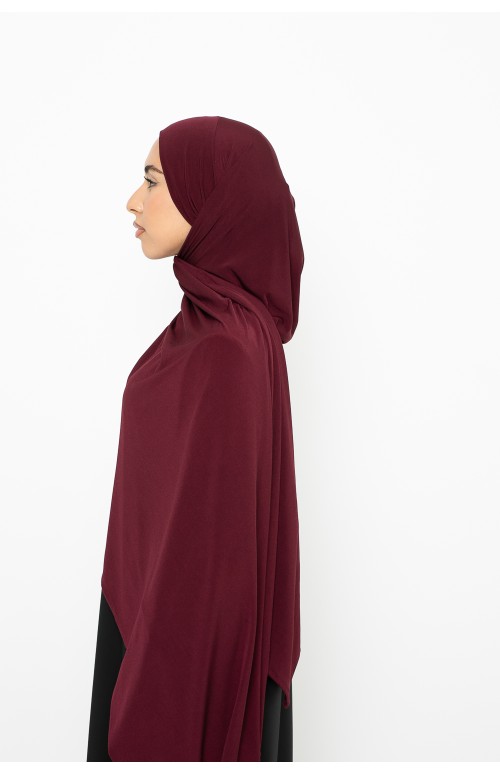 Hiyab listo para atar en jersey premium, con diseño asimétrico (lado derecho más largo), sin gorra ni alfiler, antiarrugas, opaco, suave y de fácil cuidado.