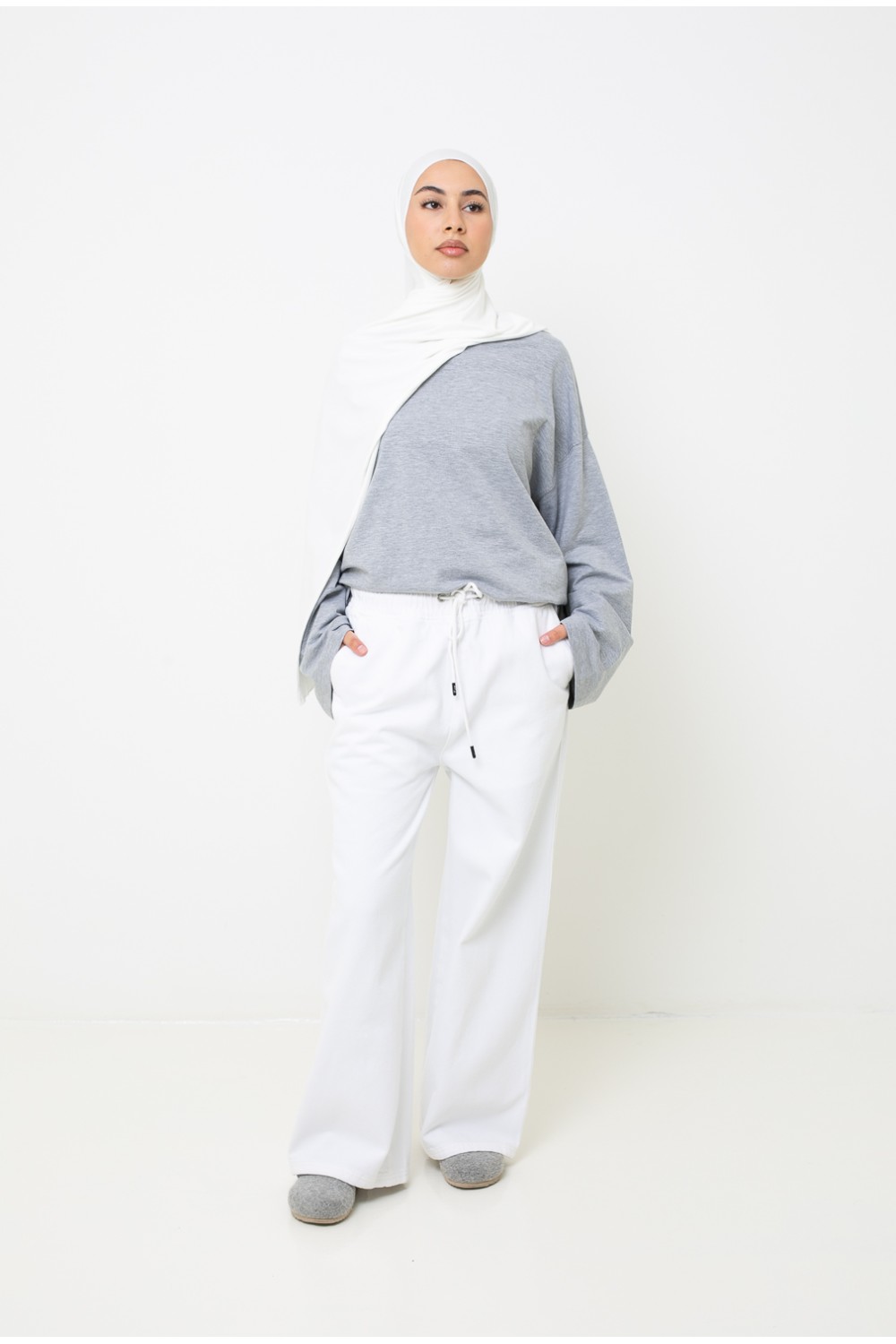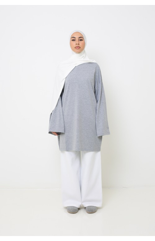 Lo combinamos con una camiseta larga gris y un hijab de jersey suave y lujoso de color blanco roto .