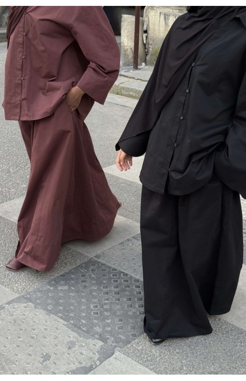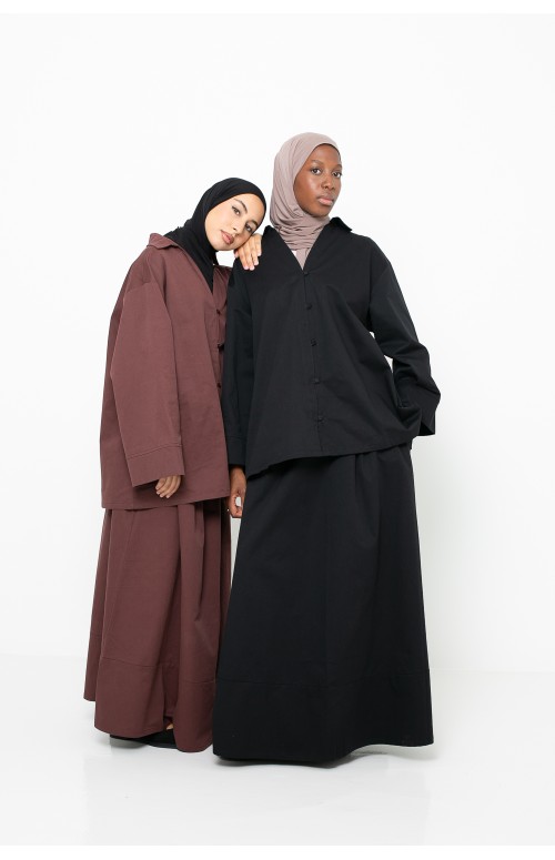 Para un estilo armonioso, lo hemos combinado con la camisa de algodón negra, el hijab de jersey premium en color topo y un par de zapatos negros.