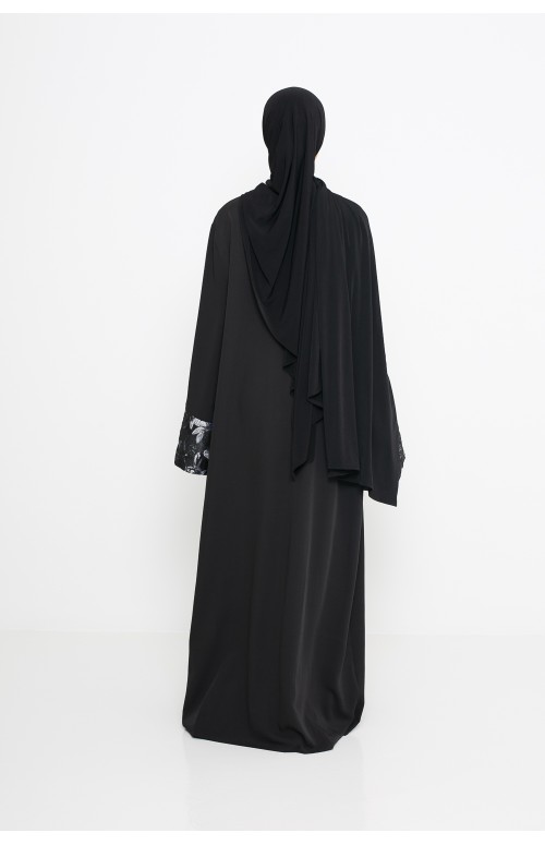 Nora lleva un vestido negro esencial y un hijab de jersey negro de primera calidad.